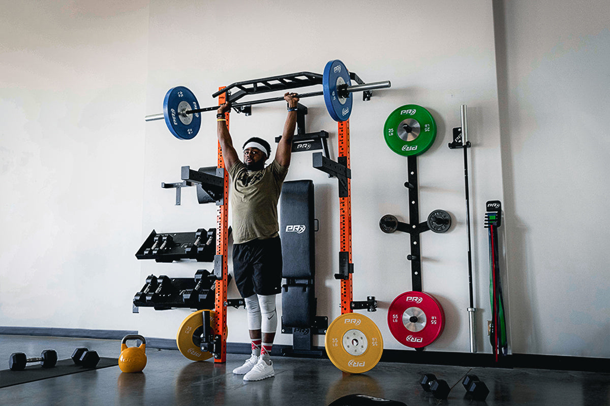 With a sleek profile that sits just 4" from the wall when not in use, this rack makes sure you don't have to sacrifice space for your home gym. Start lifting in small spaces, without compromise.