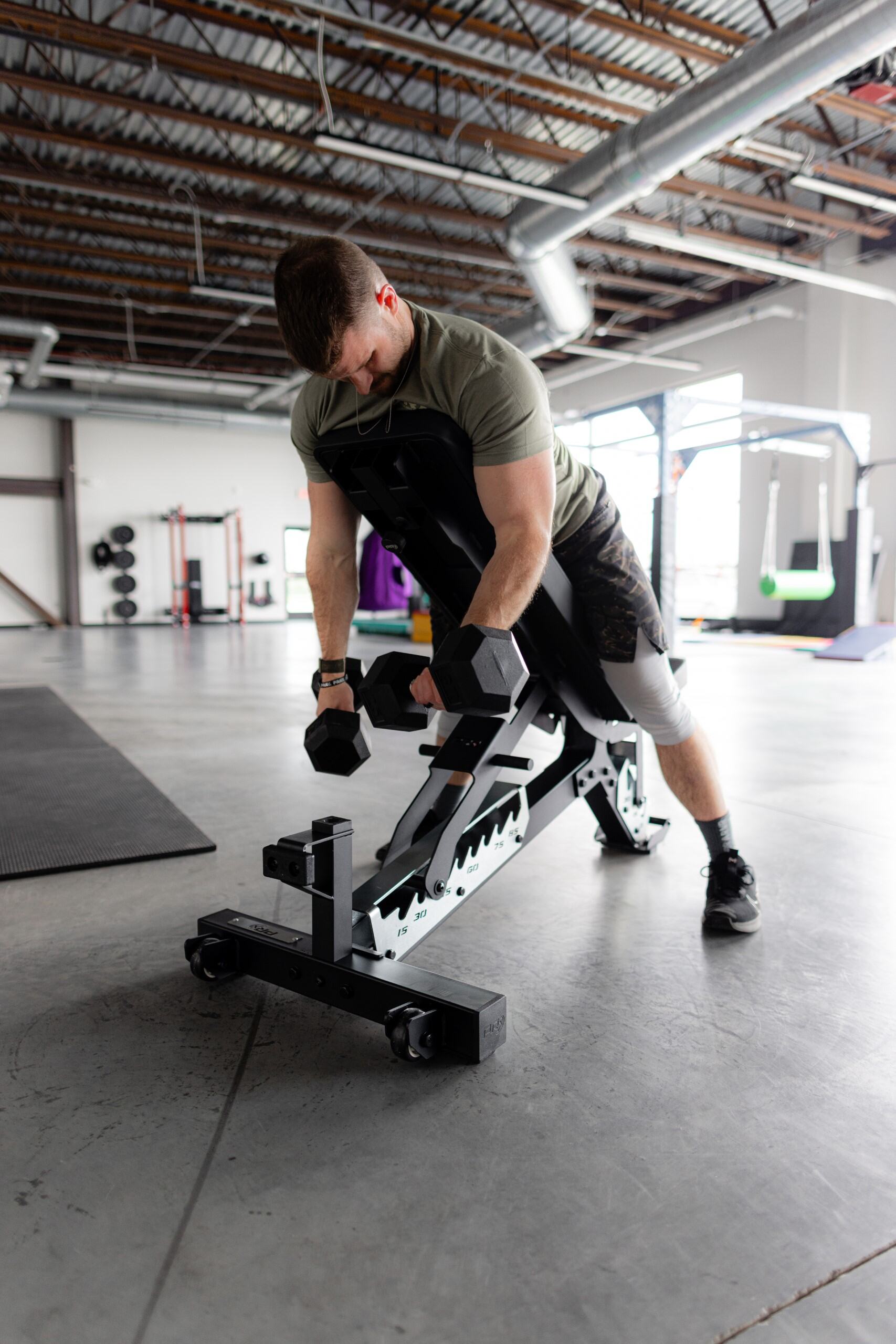 Knurled steel handles and smooth wheels make it easy to move and position, and a built-in bumper plate keeps the bench upright for sleek, vertical storage when not in use.